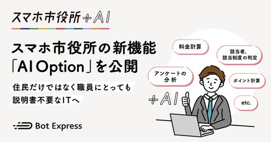 ほとんどの住民が、今、すぐに利用できるスマホ市役所「GovTech Express」を提供する株式会社Bot Express(本社:東京都港区、代表取締役:中嶋 一樹、以下 Bot Express)は、スマホ市役所の新機能として「AI Option」を本日公開したことをお知らせいたします。公開に合わせて、自治体を対象に無償で機能提供する「AI Optionモニター」の募集も開始いたします。