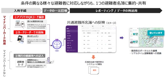 避難所受付をデジタル化する事で、避難者と自治体職員の受付時間の短縮や負担の軽減等の実証実験を実施したものとなります。
