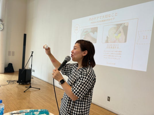 「立つ」「歩く」等の日常動作における爪の役割を解説するマルナニエ代表の小磯。子供から高齢者まで幅広い世代に正しい爪ケアについて講演を行っている。