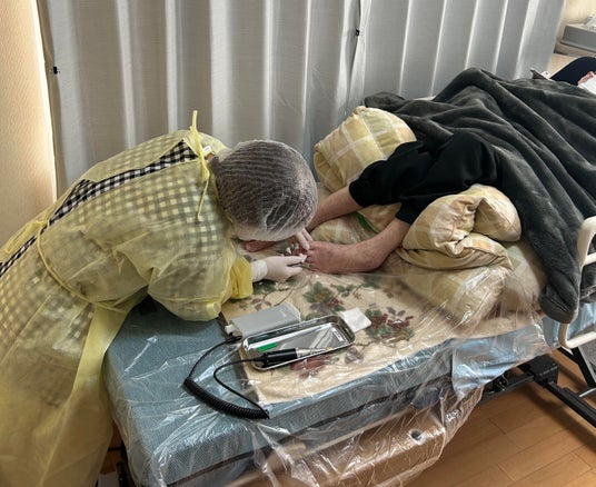 高齢者施設や自宅を訪問して施術を行う様子。厚く硬く変形した爪を切るには、専門の技術と器具が必要になる。