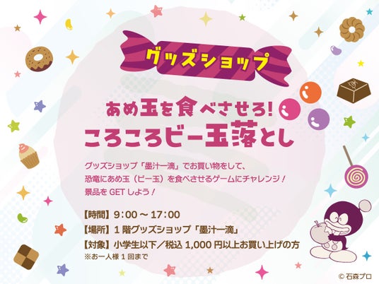 1階のグッズショップ「墨汁一滴」でお買い物をして、恐竜にあめ玉(ビー玉)を食べさせるゲームにチャレンジして景品をGETしよう!