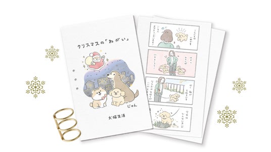 また、じゅんさんが描く、3頭のわんちゃんの「クリスマスの『ねがい』」をテーマにした心温まるストーリーカードが25枚入っています。毎日1話ずつ開けるワクワク感があり、付属のリングにまとめることで25日で1つのストーリーブックとなります。