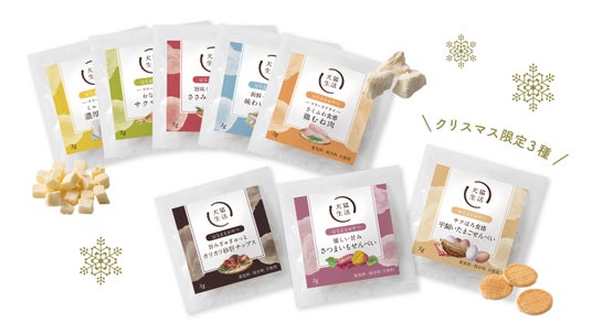 飼い主さんがわんちゃんに安心して与えられる、素材や製法にこだわった高品質な犬猫生活のおやつ「はなまるおやつ」8種類を、アドベントカレンダー用に食べきりサイズにしました。8種類のうち3種類「やさしい甘みさつまいもせんべい」「平飼いたまごせんべい」「カリカリ砂ぎもチップス」は、クリスマス限定商品です。