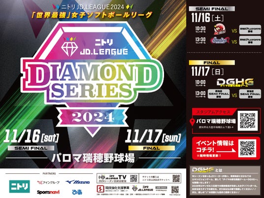 JD.LEAGUE東西地区上位チームによるプレーオフは、11月9日(土)・10日(日)に昨年に引き続き、等々力球場(神奈川県川崎市)で開催いたします。スピード感と迫力満点のソフトボールとともに、東急電鉄とのコラボ企画をお楽しみください。また、翌週の11月16日(土)・17日(日)、パロマ瑞穂野球場(愛知県名古屋市)にてニトリJD.LEAGUE 2024ダイヤモンドシリーズを開催いたします。東地区初優勝の日立サンディーバと西地区3連覇のトヨタレッドテリアーズに対し、プレーオフを勝ち上がった2チームが挑み、年間王者を決定する最高峰の戦いを繰り広げます。