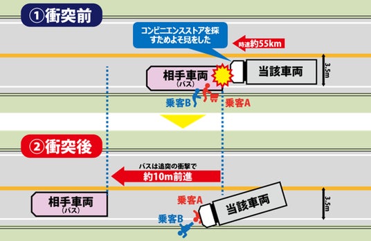 ドライバーは当初計画以上の荷下ろし作業で疲労し、眠気を感じながらも休憩場所を探しながら走行していた。そのため前方に対する注意が不十分となり、停車中の乗合バスを発見するのが遅れ、追突。