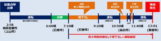 通常、荷下ろしは、配送先の従業員と2人で行うことになっているが、事故当日は3ヶ所のうちA社とC社では1人で荷下ろしを行っており、通常より負担の重い作業となった。また、A社での1人での荷下ろしに約2時間10分を要したため、B社以降の荷下ろしの予定時間に間に合うよう7時10分頃から事故発生時の13時01分まで、約6時間休憩を取らないまま荷下ろしと運転を継続している。当該事業者は、運転者への負担増となる配送先での荷下ろし作業について、適切に管理していなかったと考えられる。