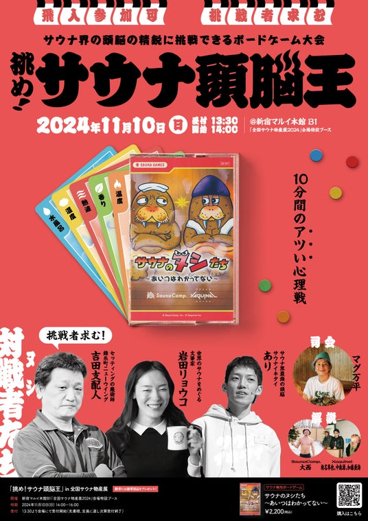 SaunaCamp.がリリースするサウナ専用ボードゲーム「サウナのヌシたち~あいつはわかってない~」をプレイするイベント。サウナ界の頭脳の精鋭が、一般来場者と対決する内容を予定してます。勝者には豪華景品をプレゼント!