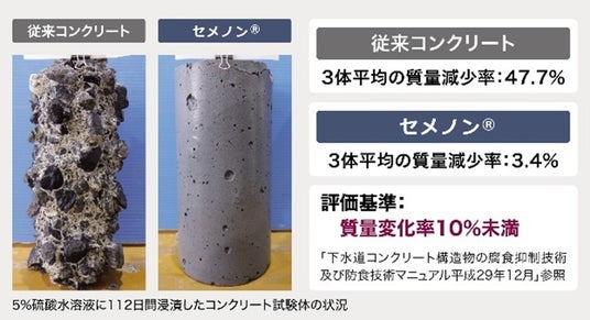 ジオポリマーコンクリート「セメノン(R)」*1は、アルカリ活性材料(AAMs)のうち、カルシウム(Ca)成分をほとんど含まない純粋なジオポリマー*2に分類され、カルシウム(Ca)が溶解する酸劣化の環境において高い抵抗性を有しています。