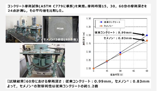 ジオポリマーコンクリート「セメノン(R)」は、従来コンクリートと比較して約15倍の耐酸性(図1)、約5倍の透水抵抗性(図2)及び1.2倍の耐摩耗性(図3)を有しており、下水道関連施設等の酸性環境下においても長寿命化を実現でき、維持管理費等の低減に貢献することができます。