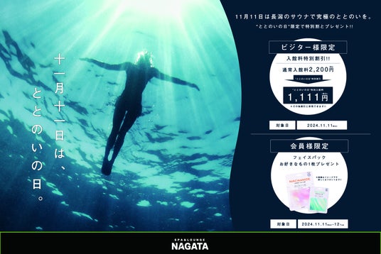 11月11日(月)「ととのいの日」は、サウナを体験することで「体と精神を整える」目的で制定されました。当館では、より多くの方に心身ともに健康になっていただきたいと思い、ビジター入館料の大幅割引を行います。通常2,200円のところ1,111円に!普段では味わえない極上な時間をスパ&ラウンジ長潟でお過ごしください。