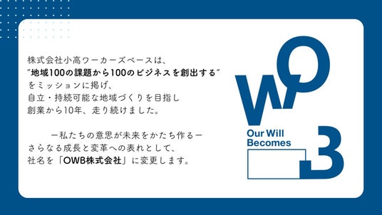 株式会社小高ワーカーズベース(本社:福島県南相馬市小高区本町1-87/代表取締役:和田 智行)は、2024年11月1日付で、OWB株式会社へと社名変更いたしました。