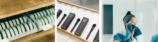 左 :鳥取県進製作所とのコラボ商品。低温熟成コールドプロセス製法で、植物由来の油脂100%にこだわった洗顔石鹸 中央:世界に誇る伝統的工芸品である熊野の毛筆の製法を活かした熊野筆のメイクブラシ。環境配慮の観点から、毛にはペットボトルを原料とした再生ポリエステル繊維も利用 右 :愛媛県を代表する地場産業である今治タオル工業組合認定の「今治産のタオル」。天然の酵素と微量な酸を使用して綿の精錬・漂白をおこなっているため、繊維の主成分にダメージを与えず、綿本来のやわらかさと吸水性が長く続くのが特徴 ※店舗によって品揃えが異なり、在庫がない場合がございます。