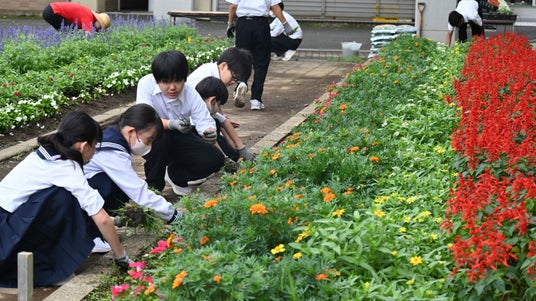 これまで花いっぱいの学校のため、主に環境整備委員会が中心に全生徒、全職員、地域の方のご協力で活動してきました。活動内容は、種まき、育苗、植え付け、灌水、花壇デザイン、除草など、自分たちでできることを全て行っています。
