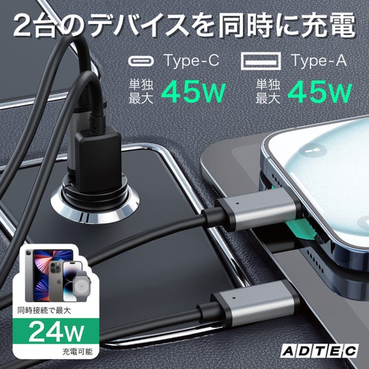 AKIBAホールディングスグループの株式会社アドテック(本社:東京都中央区、代表取締役社長:下津弘享、以下「アドテック」)は、シガーソケットで最大45W出力に対応したPD充電器「ACPD-V045AC」を2024年11月6日(水)に発売いたします。
