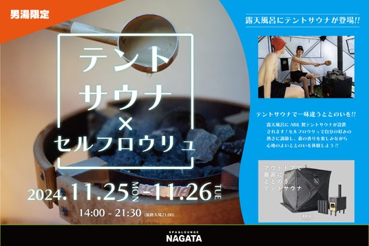 2日間限定で男性浴室にて「テントサウナ」を設置いたします。自然の風を感じながらリラックスできる環境での新しいサウナ体験が可能です。薪を燃焼させることで出る心地よい蒸気とともに、深いリラクゼーションを体験いただけます。
