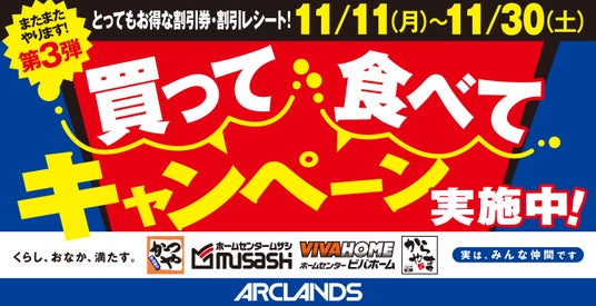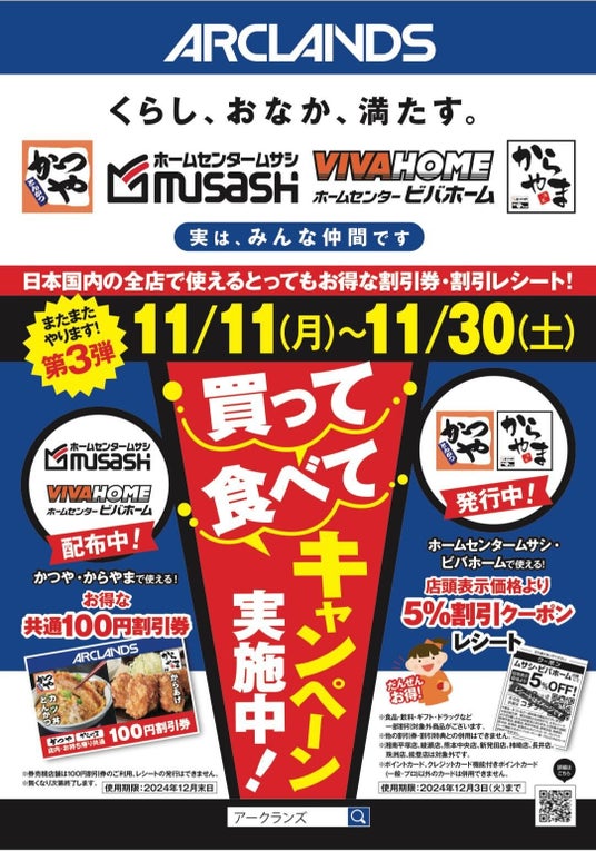 これらの状況に鑑みて、生活価値提供グループを目指し「ホームセンタームサシ」、「ビバホーム」などを運営するアークランズ株式会社と、食を通して新しい価値をお客さまへ提供するとんかつ専門店「かつや」、からあげ定食専門店「からやま」など飲食店を運営するアークランドサービスホールディングス株式会社は、2023年11月に初めて開催し、今年6月全国に対象エリアを拡大し開催した第2弾も大変ご好評をいただいた"買って 食べて キャンペーン"を「かつや」「からやま」「ホームセンタームサシ」「ビバホーム」の国内対象店舗で2024年11月11日(月)~30日(土)に開催いたします。