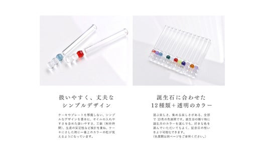 ケーキやプレートを邪魔しない、シンプルなデザインを基本に、オイルの入れやすさを含めた扱いやすさを重視しました。ケーキにさした時にひょっこりと顔を出す一番上のカラーの粒、暗闇に浮かんで見える炎は、心にもぽっと火を灯してくれます。