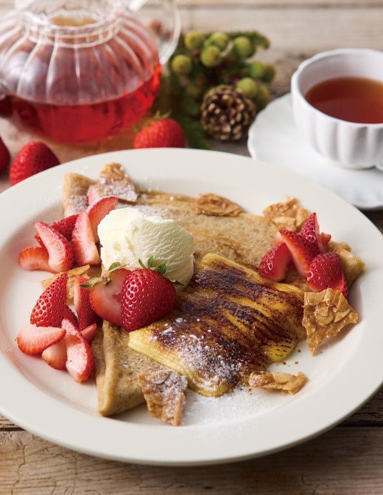 アフタヌーンティー・ラブアンドテーブル自慢のクレープは、風味豊かな発酵バター、香ばしいライ麦粉、もちもち食感を生み出すタピオカ粉で作るこだわり生地を、お店で一枚一枚丁寧に焼き上げたもの。そんなクレープ生地の美味しさがダイレクトに味わえる自家製クレープセットに、苺、ブリュレカスタード、マスカルポーネアイスクリームをトッピングした季節限定の味わいが登場します。