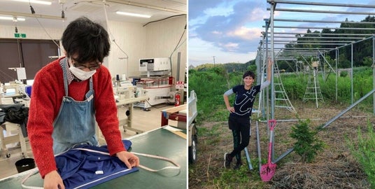 左:工房で作業中の様子(田中さん) / 右:大熊町の農場で(エミリーさん)