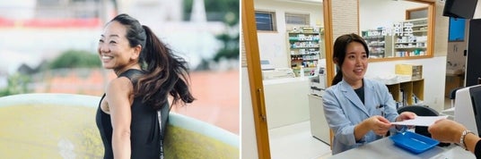 左:週末はサーフィンを楽しむ(高橋さん) / 右:薬局の事務員として勤務中(大沼さん)