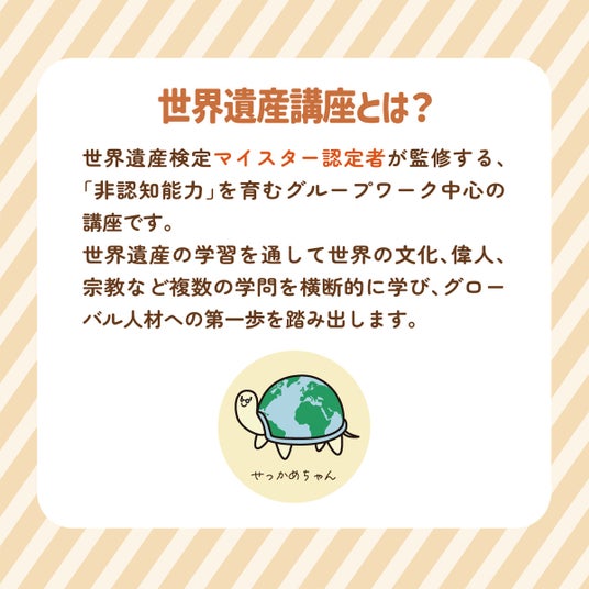 株式会社 学研ホールディングス(東京・品川/代表取締役社長:宮原博昭)のグループ会社、株式会社 学研スタディエ(さいたま市/代表取締役社長:亀谷眞宏)は、令和6年12月7日(土)に、「世界遺産講座」の本年度第10回無料トライアル(体験会)を開催いたします。