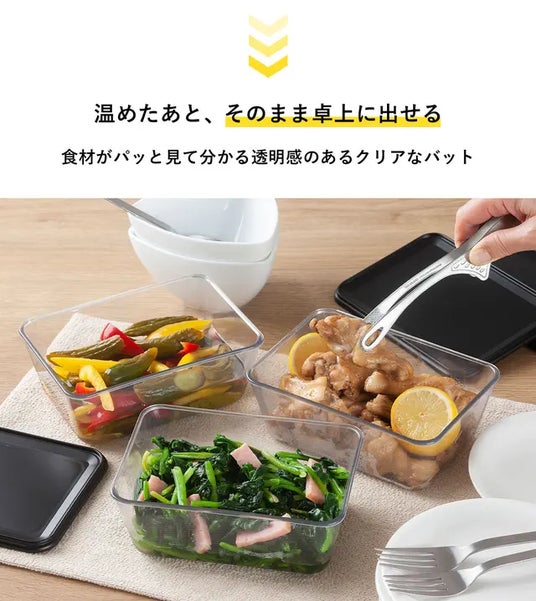 交互に重ねられるから作業スペースが広々!耐熱バットは電子レンジ使用OK!下ごしらえから料理の温めまでラクラク