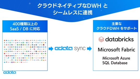 CData Sync を利用することで、Microsoft Dynamics 365(以下、Dynamics 365)、kintone、Shopify を含む400種類以上のSaaS / DB のデータをMicrosoft Fabric(OneLake、Synapse Data Warehouse)、Databricks、Azure SQL Database などのクラウドDWH に簡単に同期し、データ分析基盤を構築できます。