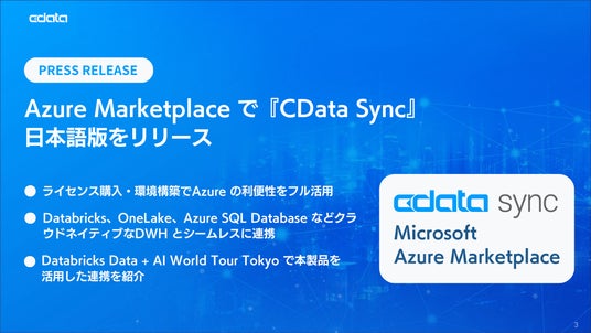 CData Software Japan 合同会社(本社:アメリカノースカロライナ州、日本オフィス:宮城県仙台市、代表社員 職務執行者:疋田 圭介、以下CData)は、ETL / ELT ツール『CData Sync』の日本語版をMicrosoft Azure Marketplace(以下、Azure Marketplace)にてリリースしました。導入時の環境構築や決済はMicrosoft Azure(以下、Azure)上で完結し、日本円を利用できるため、導入の手間を最小限に抑えてCData Sync を利用できます。