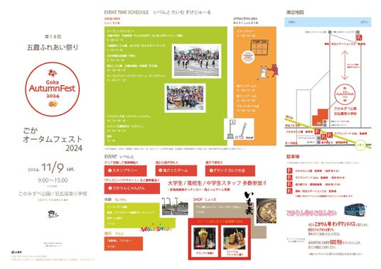 今回は会場をごかみずべ公園に移し、子供達を中心に、全ての世代が楽しめる新企画イベント「スタンプラリー」「鬼ごっこゲーム」「グラウンドゴルフ大会」を実施します。また、毎年恒例イベント「ごかりんじゃんけん」ではディズニーペアチケットや豪華賞品があたるチャンスです!楽しく学べる参加型プログラム、飲食店・物販品の提供・販売など、住民手づくりの食べて・楽しめるイベントが盛りだくさんです!