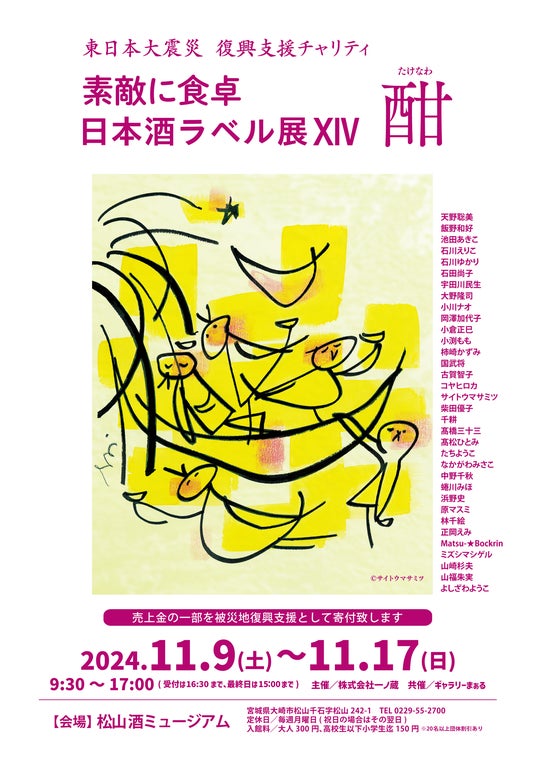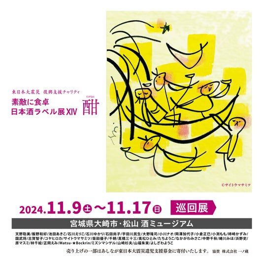 2024年11月9日(土)~ 11月17日(日)松山酒ミュージアム(宮城県大崎市松山)にて東日本大震災 復興支援チャリティ『素敵に食卓 日本酒ラベル展XIV 酣(たけなわ)』を開催する。