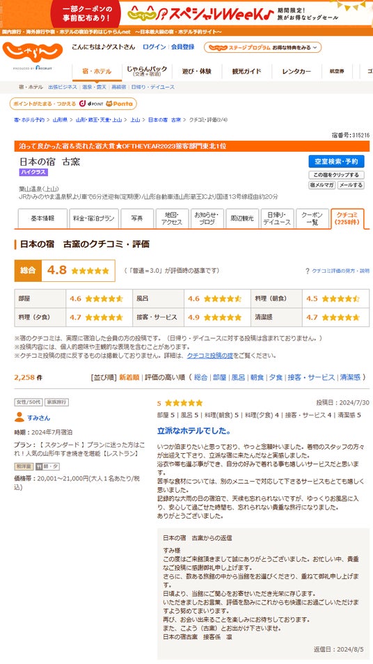 日本の宿古窯(山形県・かみのやま温泉)は、「部屋食説明のタイミングが素晴らしく」や「ほどよい距離感」など、もてなし面での評価が高かった。
