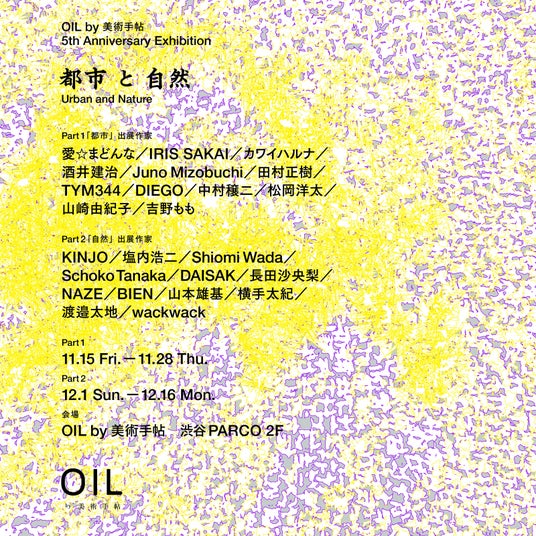 OIL by 美術手帖ギャラリー(東京都 渋谷区 渋谷PARCO2階)では、オープン5周年を記念して、5th Anniversary Exhibition「都市と自然/Urban and Nature」を11月15日(金)より開催します。同展覧会には、総勢24名のアーティストが参加。前期をPart1「都市」(11/15-28)、後期をPart2「自然」(12/1-16)として、各テーマのもと制作された作品合計50点以上を展示します。