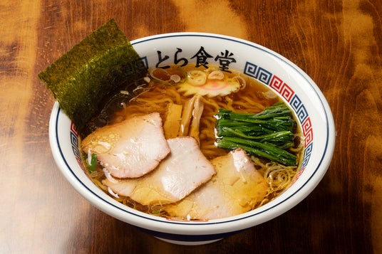 ご当地ラーメンのひとつ「白河ラーメン」(福島県)の草分け的存在『とら食堂』の「手打ち中華そば」。鶏ガラと豚骨の旨みが引き出されたスープに、強いコシが特徴の手打ち麺と炭火で炙られたチャーシューが入ったとびきりの一杯。