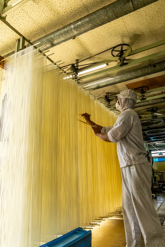 江戸時代から工程がほとんど変わっていないという三輪そうめん。仕上げの細さに延ばしたそうめんの長さは約2m。室内の温度を調節しながらゆっくりと水分を抜き乾燥させる。