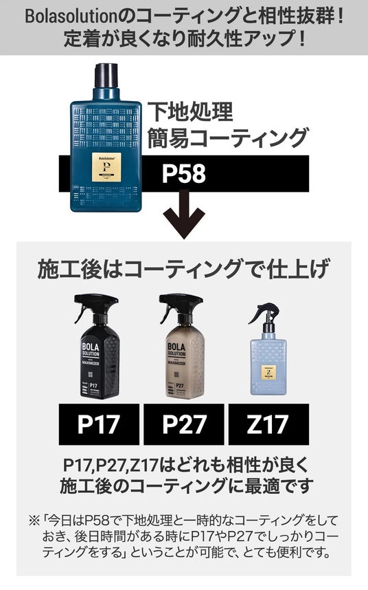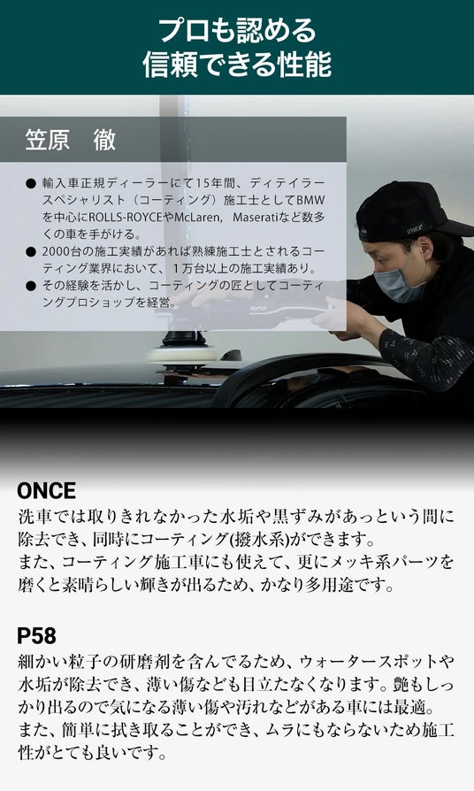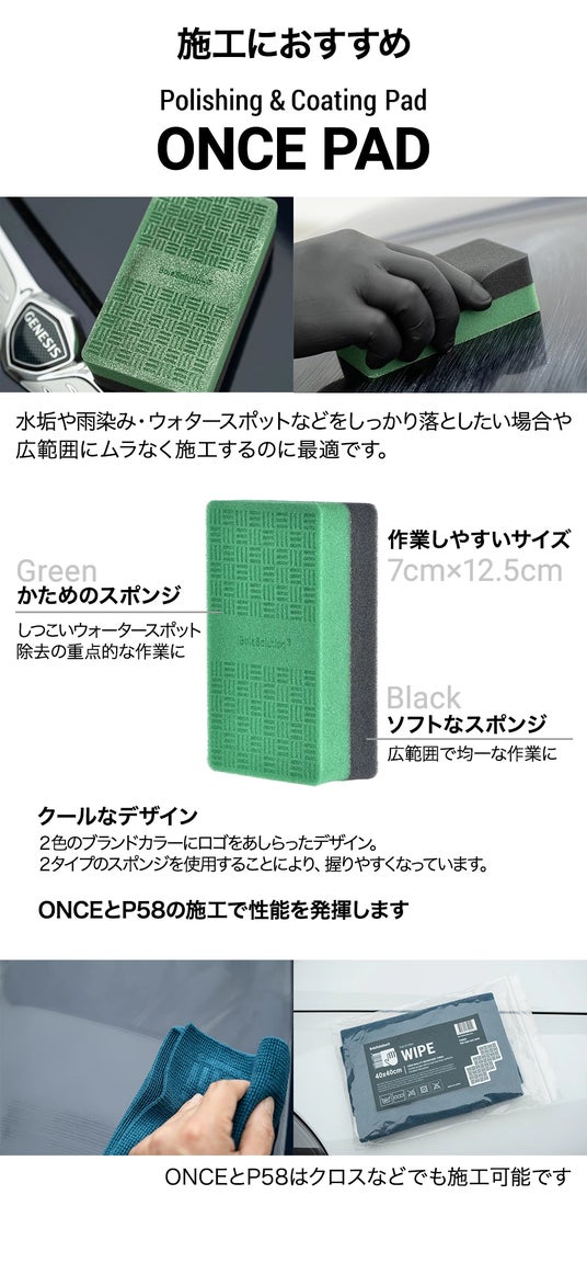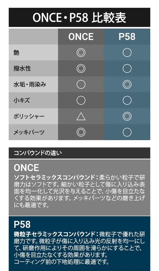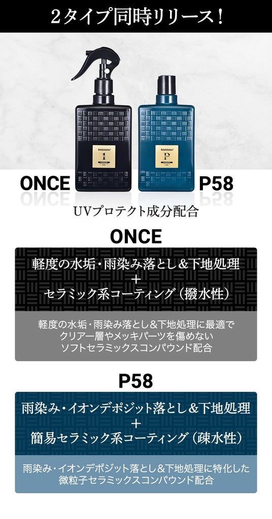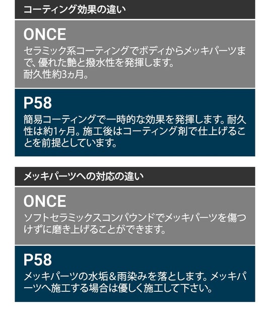 1.【ONCE】は「下地処理からコーティングまで、これ1本でオールインワンで完結します。」2.【P58】は「雨染み・イオンデポジット落としに特化し、同時に簡易コーティングの効果も発揮します。」