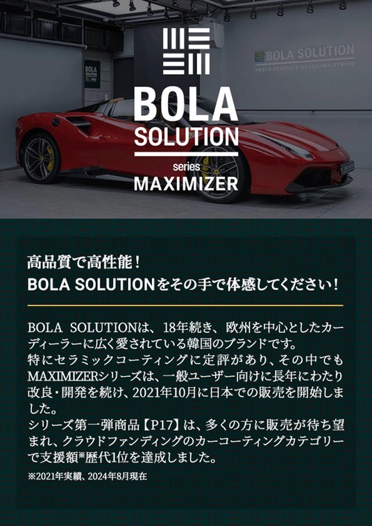 BolaSolution Japan / 株式会社Green Aqua(新潟県新潟市北区)は、大人気のカーケアブランドBOLASOLUTION(ボラソリューション)のシリーズ商品として