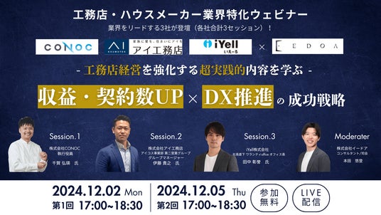 今回のセミナーでは、こうした業界の課題に正面から向き合い実績を積み重ねることで、近年の住宅業界売上高成長率トップクラスを誇るアイ工務店様(本社:大阪市中央区、代表取締役:坂井 達也)と、建築会社を技術の力や新しいソリューションで支援するCONOC様(本社:東京都渋谷区、代表取締役:山口 一)・iYell様(本社:東京都渋谷区、代表取締役:窪田 光洋)にご登壇いただき、売上向上や利益率改善、デジタル対応への具体的な解決策・ソリューションについてお話いただきます。