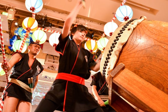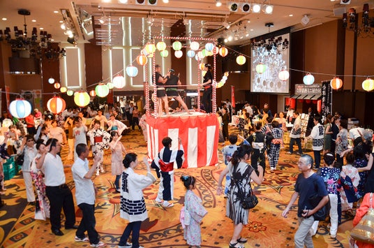 ホテルの大宴会場に組んだまつり櫓(やぐら)の周りで、迫力の太鼓の音に合わせて盆踊り。初めての方もお楽しみいただけるよう日本民踊の講師による踊り方の練習会も設けます。