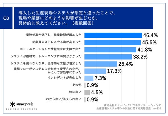 「Q3.導入した生産現場システムが想定と違ったことで、現場や業務にどのような影響が生じたか、具体的に教えてください。(複数回答)」(n=110)と質問したところ、「業務効率が低下し、作業時間が増加した」が46.4%、「従業員のストレスや不満が高まった」が45.5%、「コミュニケーションや情報共有に支障が出た」が41.8%という回答となりました。