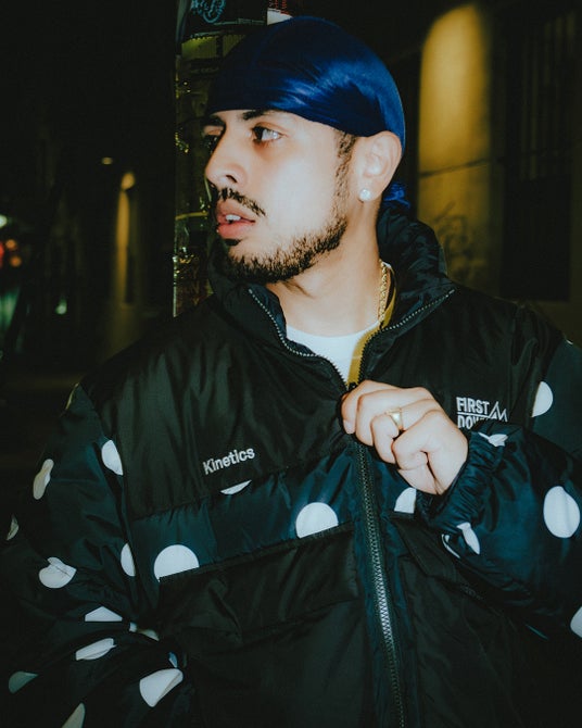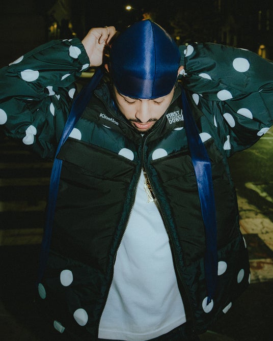 フロント、バックのキルト面にはインパクトのあるドットパターンを採用し、フロントには通常のモデルには無いフラップポケット付きのマフポケットを装備しコラボレーションならではのデザインが特徴。