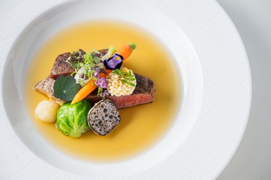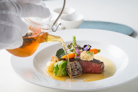 常陸牛のきめ細かいサシがブイヨンに溶け出し、旨みが凝縮された温かいスープと共に常陸牛を