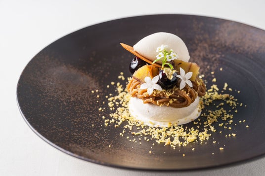 ラム香るパルフェを軽やかなメレンゲに閉じ込め、ふかさわ農園の栗を使ったマロンクリームをあしらいました。スパイス香る月桂樹のアイスクリームとのマリアージュをご堪能ください。
