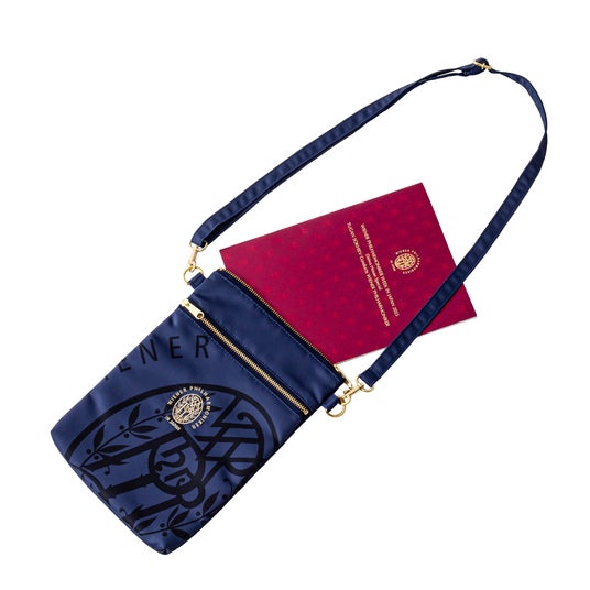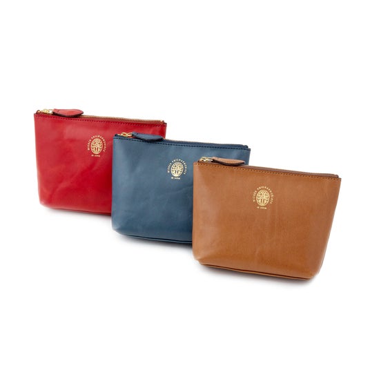 レザーポーチ(ネイビー・ブラウン・ワインレッド)7,800円 日本を代表する国産革「栃木レザー」の”匠”が丹精込めて作ったウィーン・フィルのロゴが金の箔押しで入った高級感のある本革製のオリジナルポーチ。
