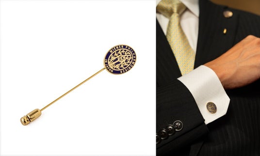 ラペルピン3,000円/カフス6,500円/ネクタイ(ネイビー・イエロー・グレー)7,800円 日本の伝統工芸技法である「本七宝」で作られたカフスとラペルピンです。定番人気のネクタイと合わせて3点セットでお使いいただくと統一感あるスタイルになり、フォーマルな場での気分を一層盛り上げてくれます。