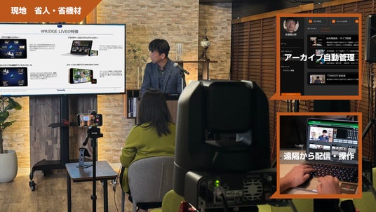 『WRIDGE LIVE』は、Live Solution「WRIDGE」のコアサービスで、複数拠点の映像ソースをクラウド上に集約し、遠隔からスマートフォン1つで誰でも簡単にスイッチング操作や映像配信ができる配信サービスです。ライブ配信の需要増加の一方で、専門知識のある人材の人手不足が課題として如実に増加しています。WRIDGE LIVEはそのような人手不足の課題を解消するソリューションとして、ライブ配信の無人化・省人力化をめざしています。今回発売のPTZカメラリモートコントロールアプリケーション「WRIDGE RCA」により、イベント会場や社内大会議室の講演や学校の講義等についてPTZカメラ※2を用いて、誰でも簡単に省人力のライブ配信が可能になります。