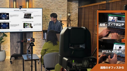 イベントホールや会議室に常設したPTZカメラの遠隔操作で、専門知識不要で誰でも遠隔地から簡単に講演・会議のリモート配信が可能に! 配信に特別な機材不要