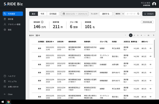 「S.RIDE Biz」は、受注開始以降、好調な申込み数を維持し続けており、11月現在で、申込み社数は900社を突破しました。タクシーの利用金額を請求書で一括払いできる機能や、利用履歴を管理ページで簡単に参照できる機能は、管理部門の業務効率化に大きく貢献すると、多くの企業から高い評価をいただいています。