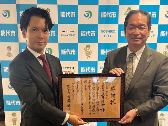左:有限会社アクアテック 代表取締役 大和田 健斗、右:能代市長 齊藤滋宣氏