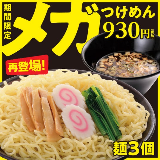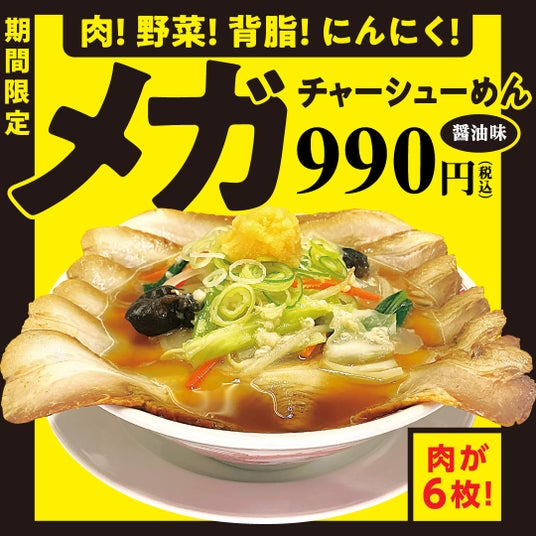 株式会社幸楽苑(本社:福島県郡山市)が運営する「幸楽苑」は、2024年11月15日(金)から期間限定で、にんにく、背脂、野菜がたっぷりで、プレミアムチャーシューを6枚トッピングした「メガチャーシューめん」990円と、先月末に販売終了した商品でお客様から再販のご要望を数多くいただいた、特製つけダレと麺量が通常の2倍の「メガつけめん」930円を販売開始いたします。