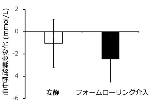 末梢血乳酸は疲労物質ではありませんが、代謝性アシドーシスなど筋疲労の要因と同様の変化を見せることから、筋疲労の間接指標になると言われています。そこで、本研究ではフォームローリング介入 (図1) が血中乳酸の低下を起こすか検証することで、筋疲労改善に有効か検証しました。健康な成人18名がが疲労困憊に至る漸増負荷運動試験を行い、その後4分間のフォームローリング介入を行う実験条件と、安静に休息を行う安静条件に参加しました。その結果、漸増負荷運動によって増加した血中乳酸は、安静条件に比べてフォームローリング後に有意に低下しました (図2)。さらに血中乳酸の低下が大きい人ほど、認知機能の回復と関連することが示されました。